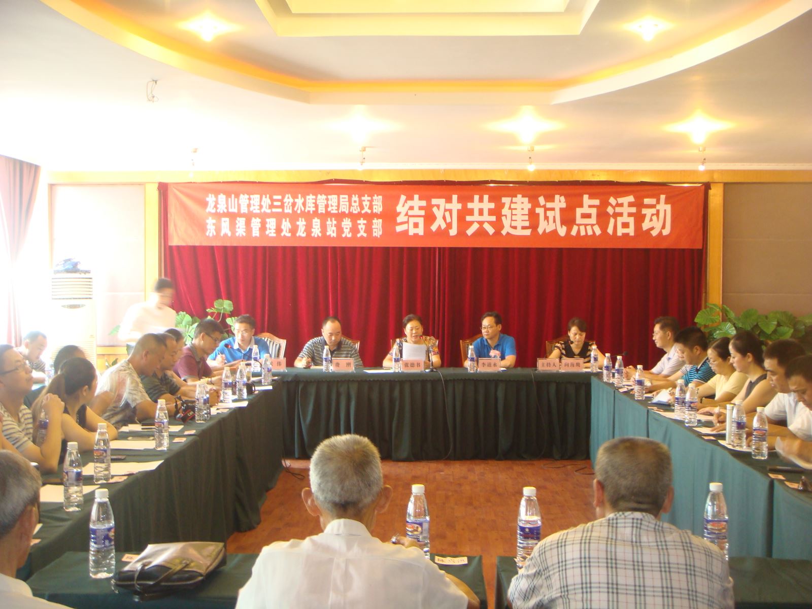 7月30日,龙泉山灌区管理处三岔水库管理局党总支部和东风渠管理处龙泉站党支部结对共建试点活动在三岔举行。都管局党办主任费刚、东风渠管理处副处长李道永、党办主任张伟和龙泉站全体在职党员、龙灌处党委副书记张德书及党办工作人员、三岔局在职党员及退休党员代表共50人参加了会议。会议由龙灌处党委办主任向海鹰同志主持。