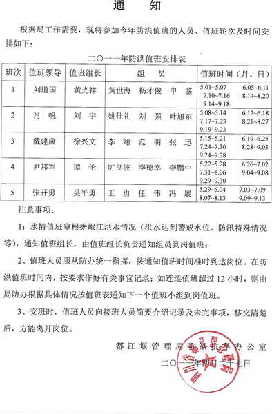 都江堰管理局2011年防洪值班通知