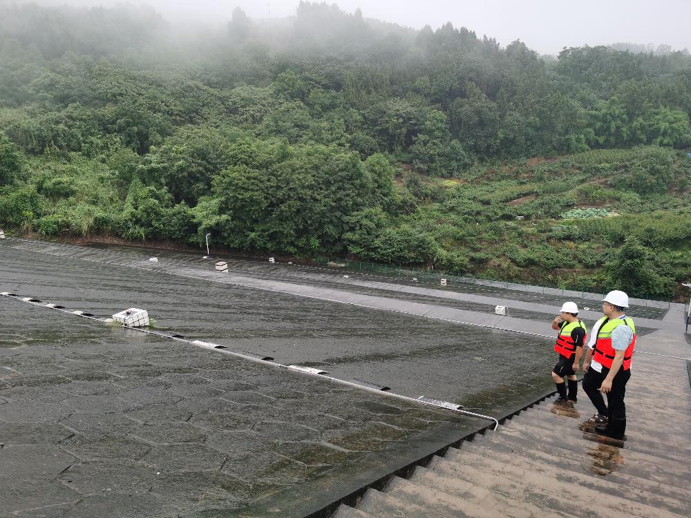 (雨中对张家岩水库主坝背坡面进行安全排查)