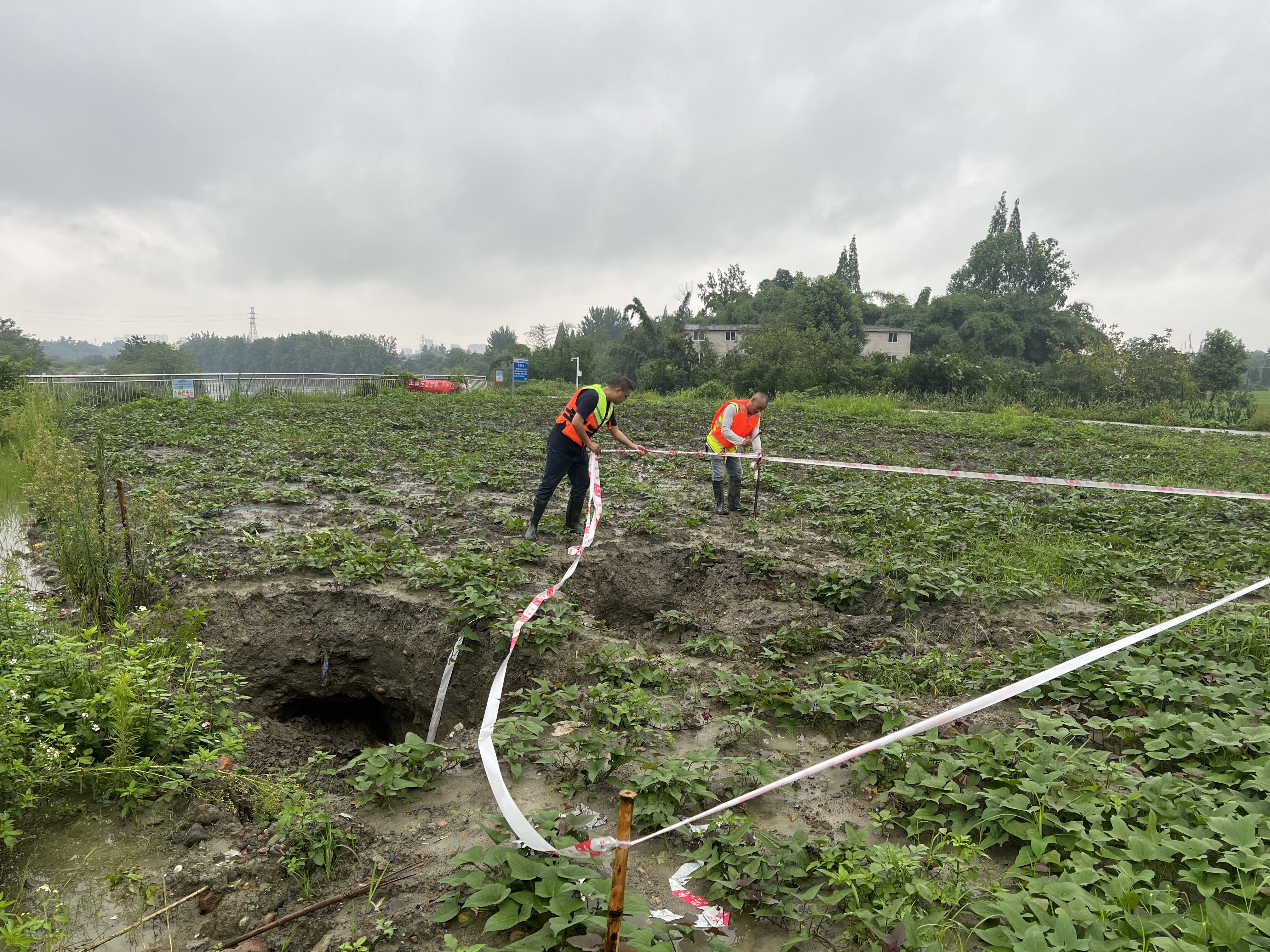 (苟家滩水利管理站工作人员在拦河闸前复耕处沉陷段张拉警示带)