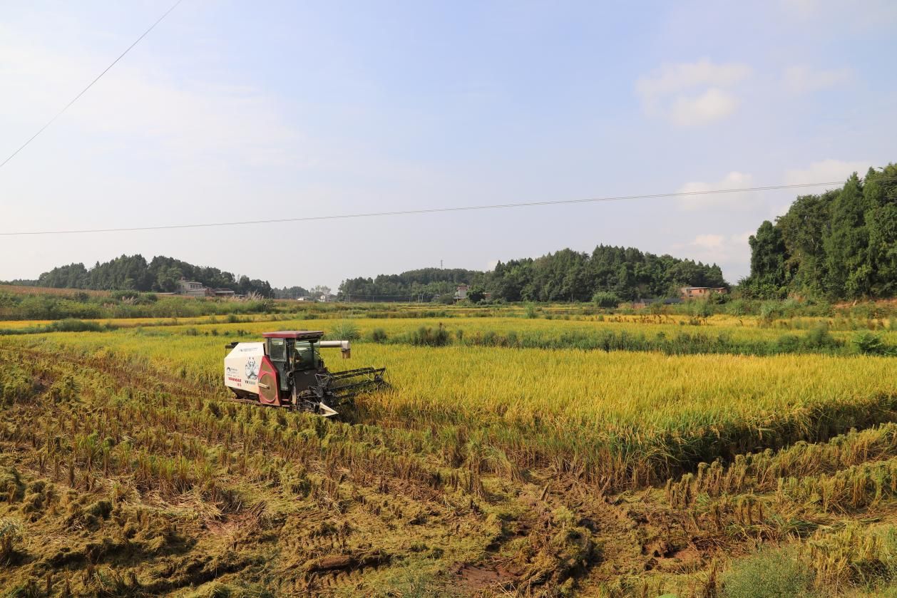(都江堰龙泉山灌区收割机抢收稻谷)