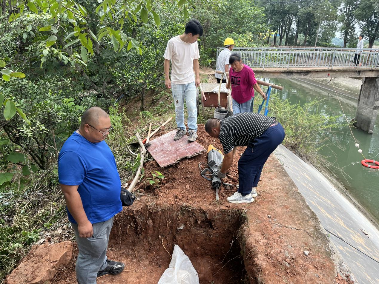 2023年7月17日19:20左右,东部新区水利管理站接到巡渠人员反映,发现充水南干渠桩号8+600处右岸护坡出现沉降,并形成一处直径0.5米,深度0.75米的孔洞,存在较大安全隐患。东部新区水利管理站高度重视、迅速响应,立即组织技术人员赶赴现场进行紧急抢修。