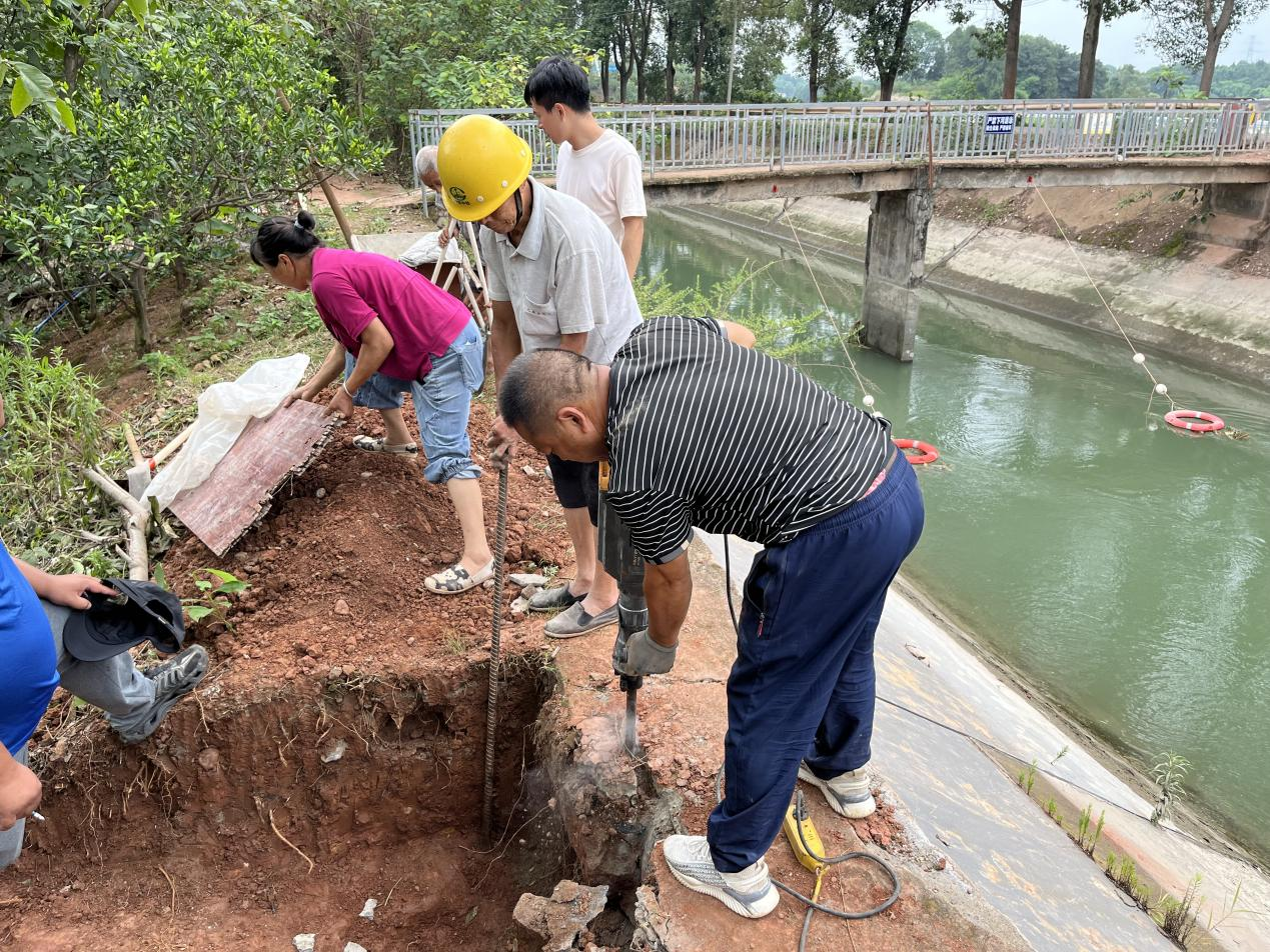 20日处应急抢险队按照抢修方案对隐患点位加紧进行整治,对孔洞周围的松软土体进行清除,采用水泥砂浆灌填土体与砼护坡交界处空隙,回填粘土夯实,顶部再采用砼进行封闭。通过东部新区水利管理站和应急抢险队两天两夜的全力奋战,不间断抢修施工,20日上午11时抢修任务顺利完成,有效确保了渠道工程运行及灌区保供安全。
