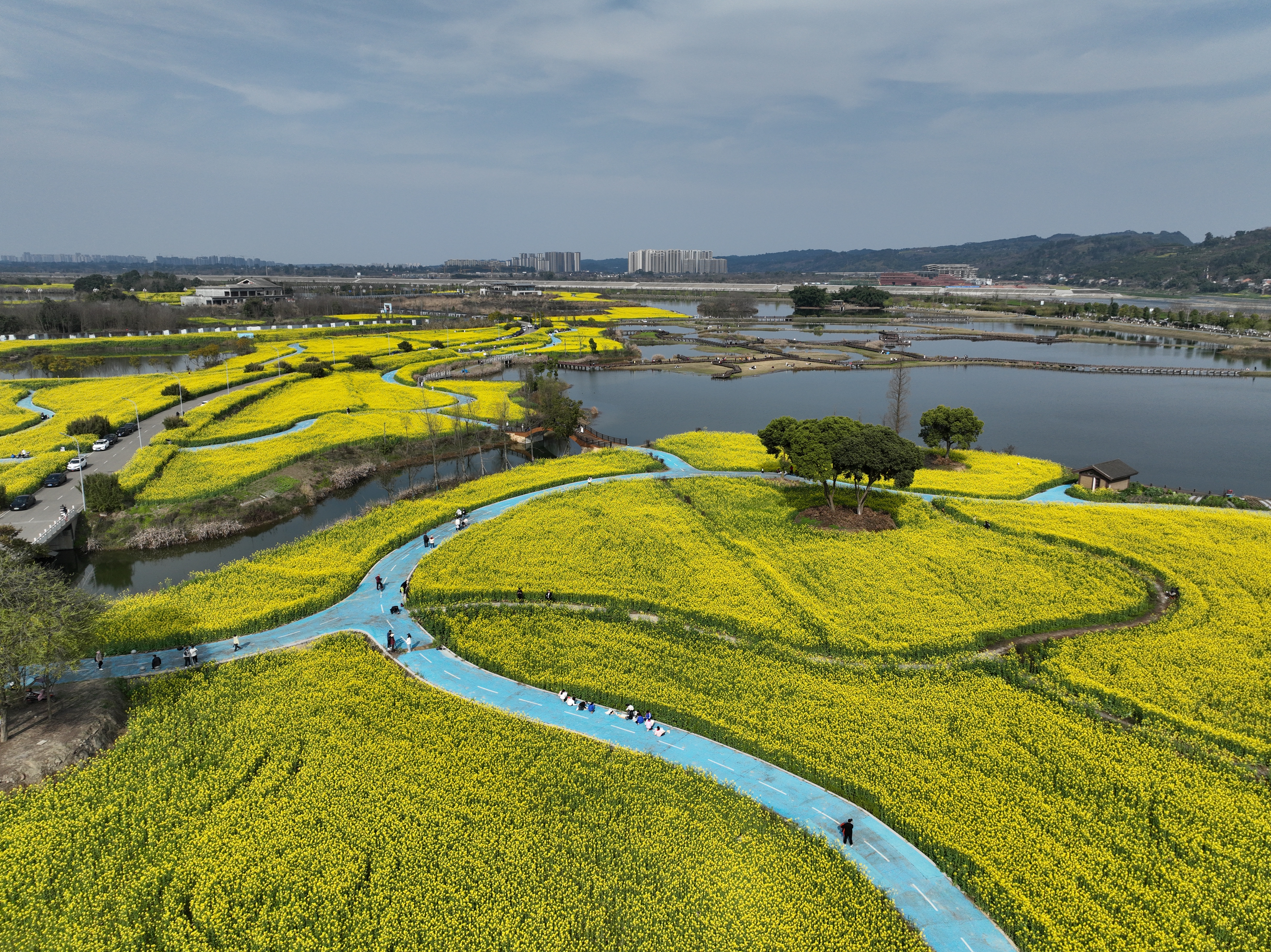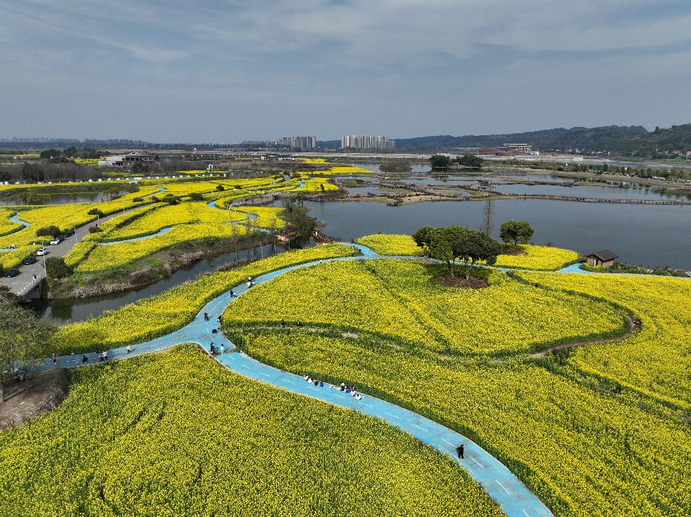 三月伊始,春意渐浓。通济堰灌区的彭山区五湖四海湿地公园,一场春日盛宴正悄然上演。上千亩油菜花竞相绽放,宛如金色的海洋,与碧波荡漾的湖水交相辉映,构成了一幅绝美的春日画卷。