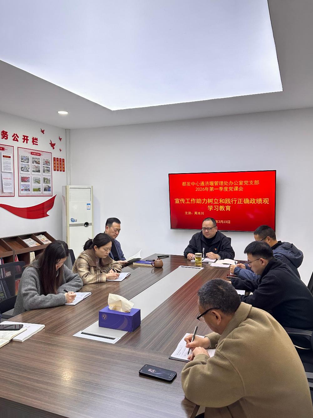 2026年3月23日上午,都发中心通济堰管理处办公室党支部召开2026年第一季度党课暨树立和践行正确政绩观专题学习会,围绕“宣传工作助力树立和践行正确政绩观”及“在全党开展树立和践行正确政绩观学习教育”主题开展集中学习。支部书记周本川主持会议,党委委员、副处长竹耄伦以普通党员身份参加。