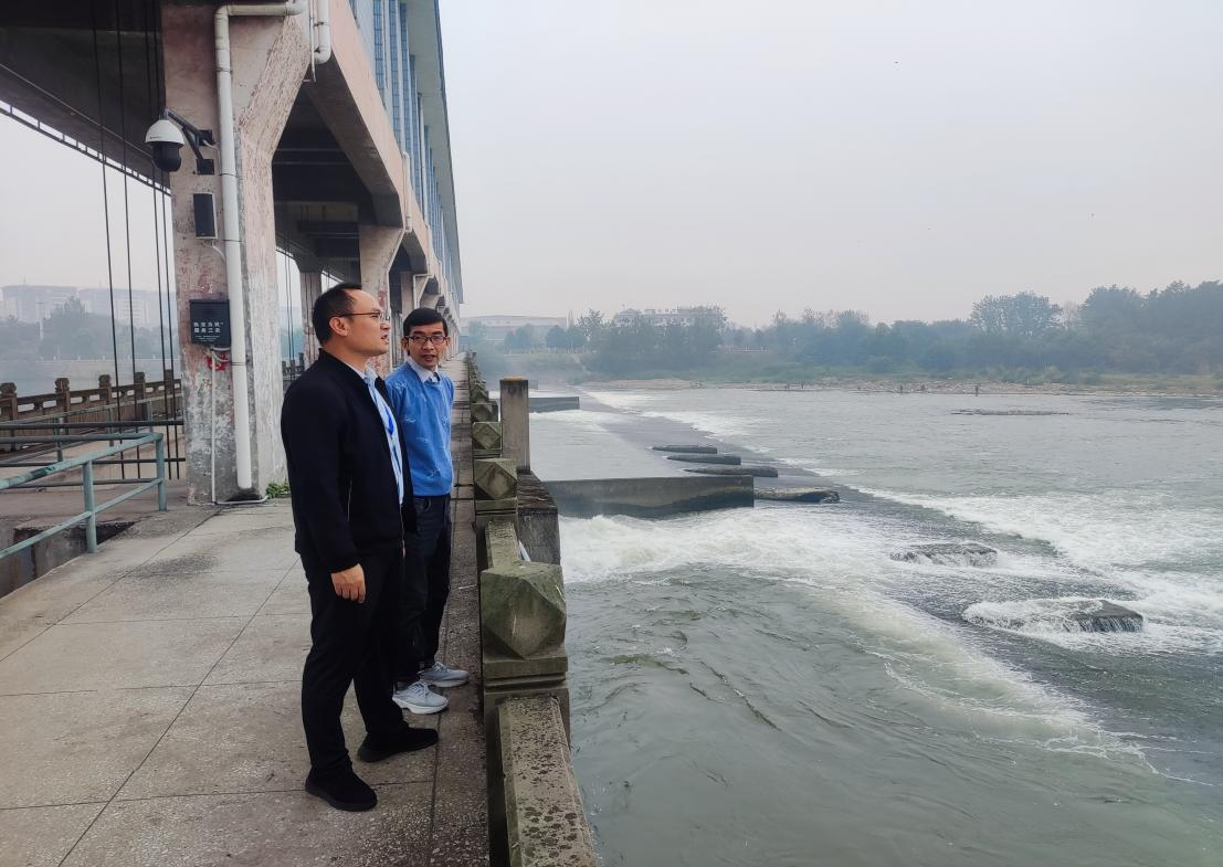 (组长杨旭东在通济堰渠首拦河坝介绍通济堰)