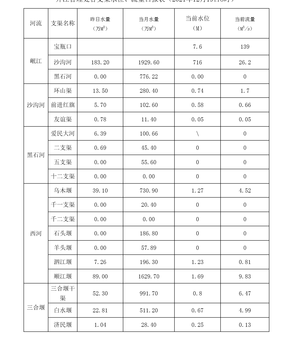 外江管理处各支渠水位、流量日报表(2021年12月19日8时)