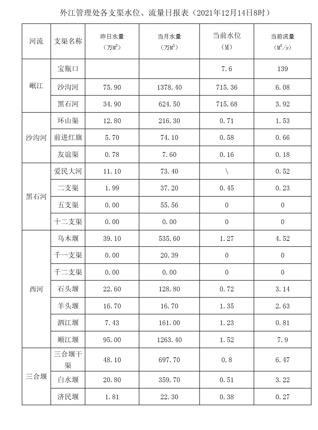 外江管理处各支渠水位、流量日报表(2021年12月14日8时)