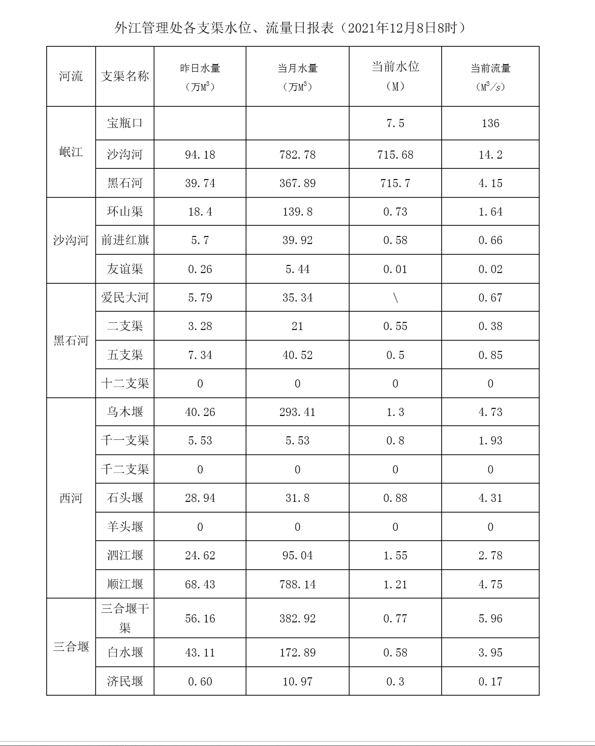 外江管理处各支渠水位、流量日报表(2021年12月8日8时)