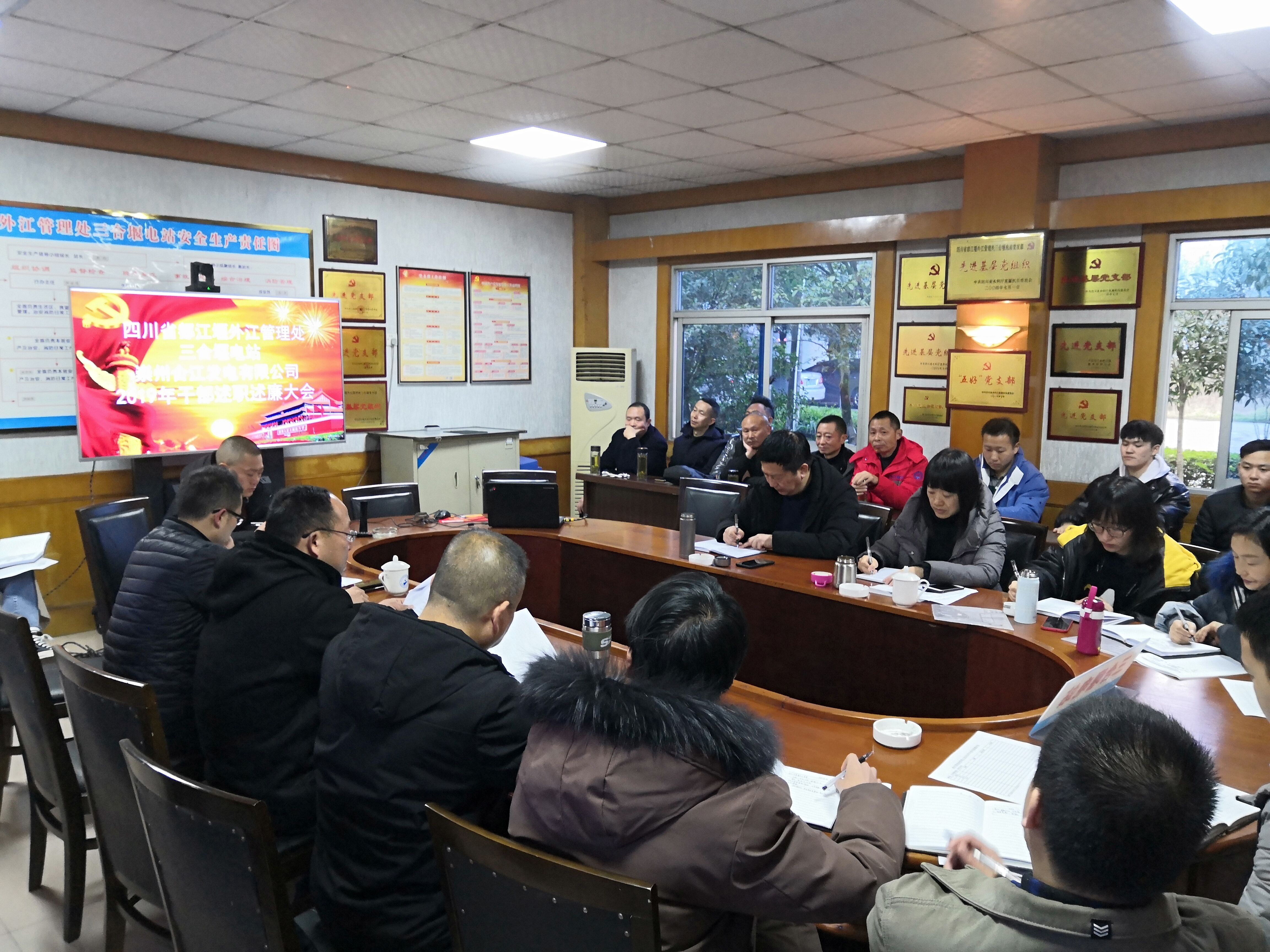 2019年12月26日上午,三合堰电站和合江公司召开干部述廉述职大会,电站全体人员参加,会议由站长黄均主持,纪委书记蔡显宏和处人事科副科长杜秋秋一行到会指导。
