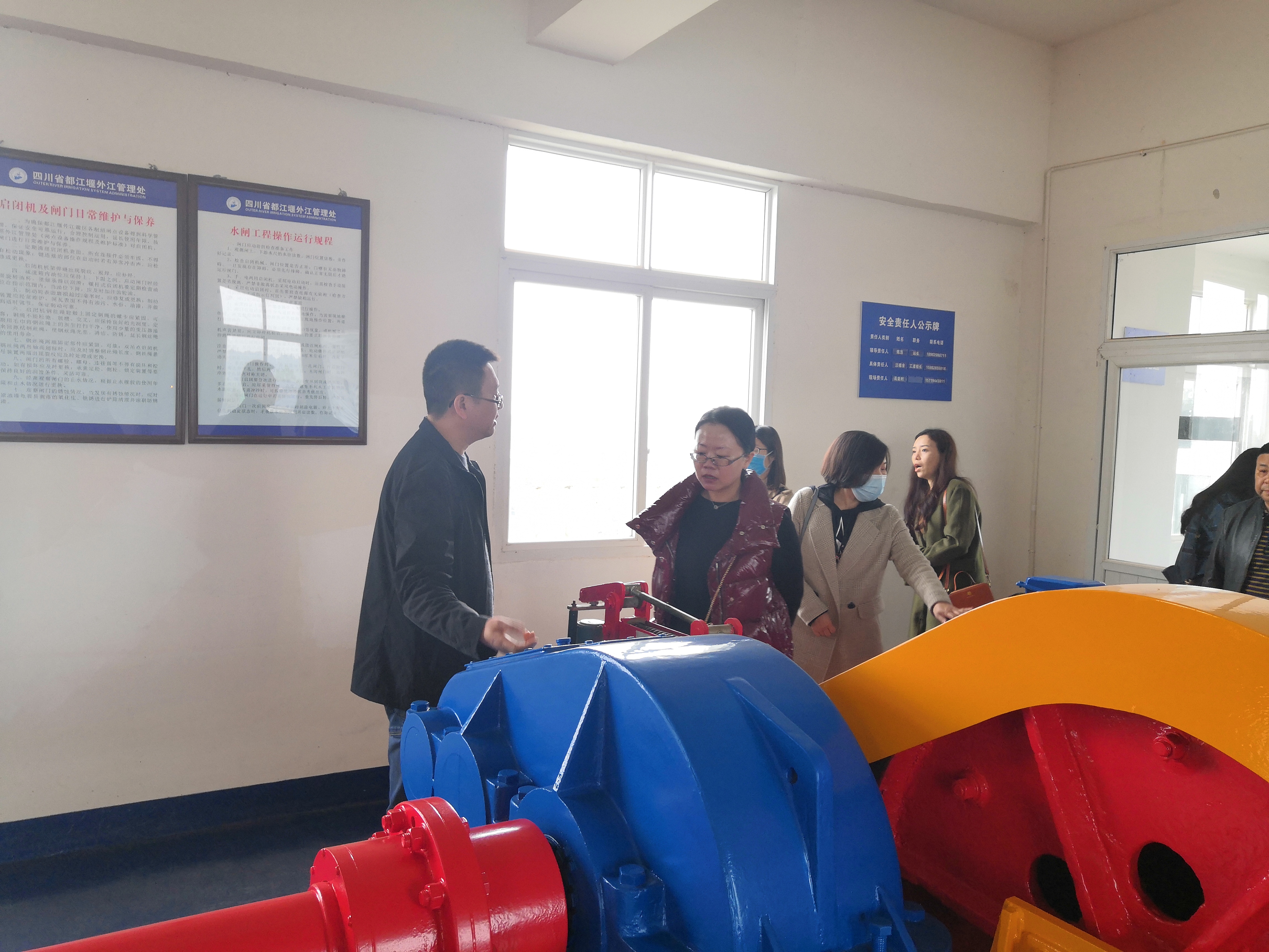 工程科科长林拥军在施工现场详细介绍三合堰管理点升级改造工程项目建设内容、施工进度、建成效果。随后林科长带领财务科全体职工参观并讲解三合堰取水枢纽启闭机、闸门和防汛物资。(财务科 王龙)