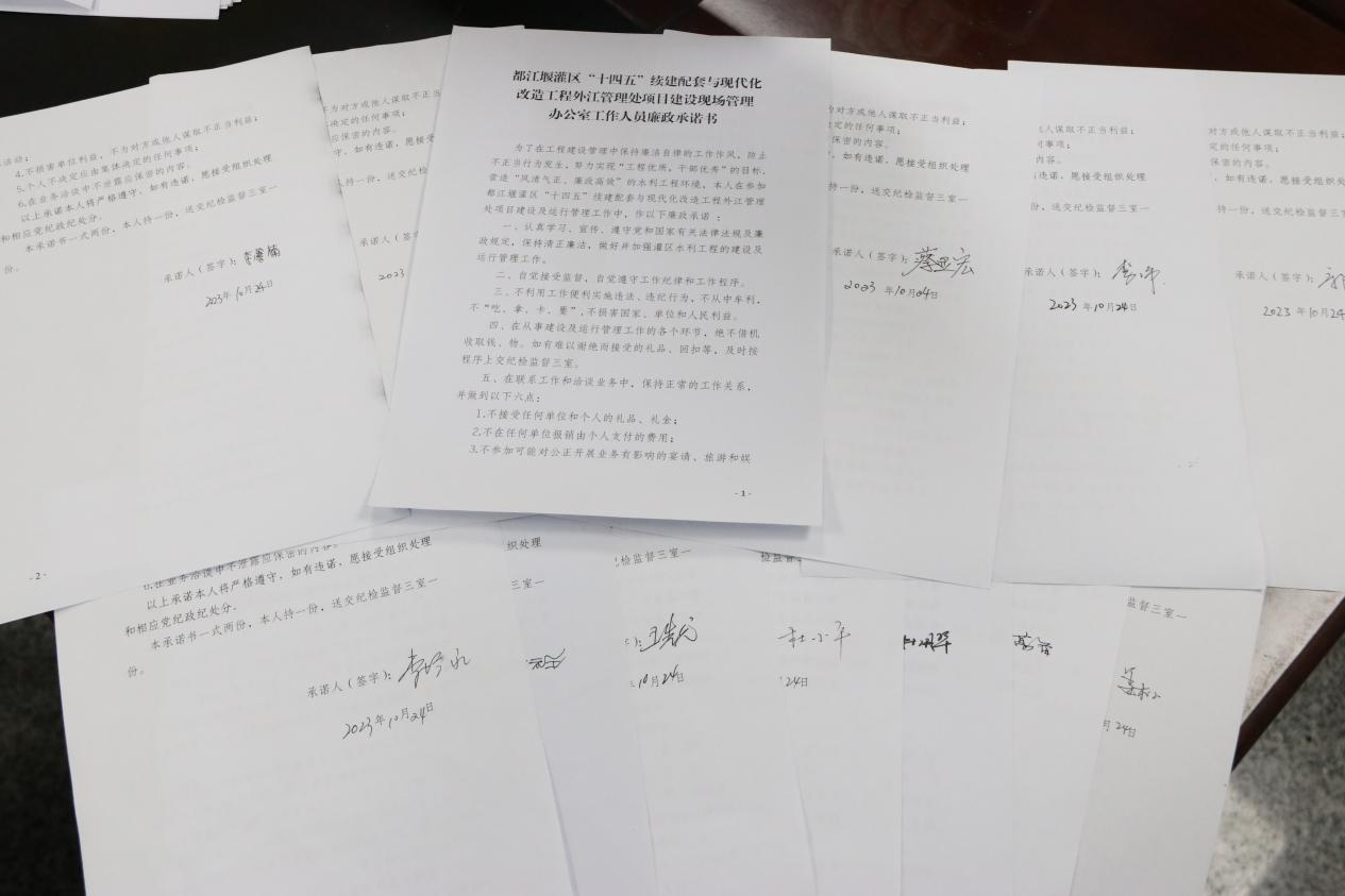 坚持“律己律人”廉洁理念,参建五方主体签订《廉政承诺书》,切实把党风廉政建设规定纳入工程建设管理范围,将廉洁自律的工作作风作为实现“优质工程,精品工程”的庄重承诺。大家纷纷表示,一定时刻保持清醒的头脑,知责于心,恪尽职守,积极投身工程建设,积极作为,攻坚克难,顺利完成预定目标任务。