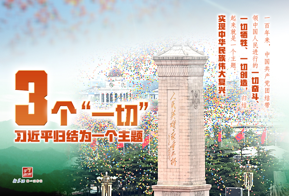 “一百年来,中国共产党团结带领中国人民进行的一切奋斗、一切牺牲、一切创造,归结起来就是一个主题:实现中华民族伟大复兴。”
