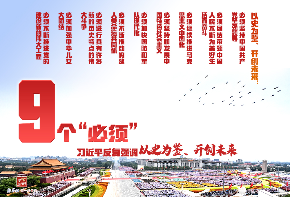 在庆祝中国共产党成立100周年大会上,习近平总书记回顾百年光辉历程,反复强调以史为鉴、开创未来。他用九个“必须”,指引出“开创未来”的方向。