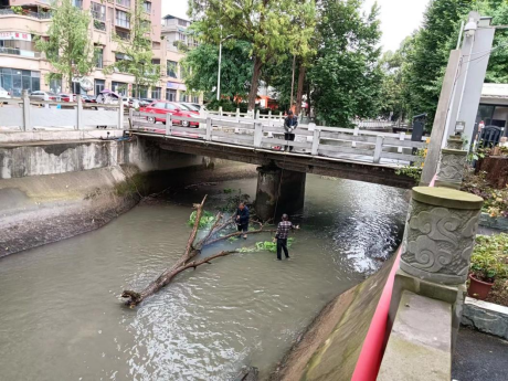 6月4日,大邑水利管理站组织相关人员打捞倒入渠道的树木。