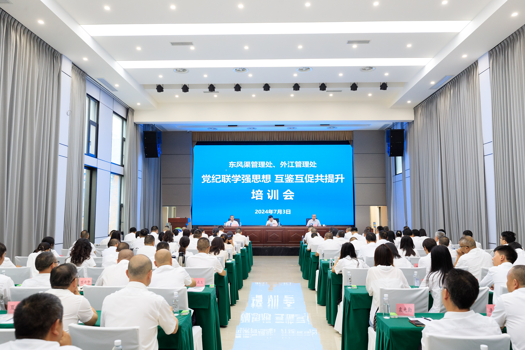 7月3日,都发中心外江管理处与东风渠管理处联合开展“党纪联学强思想,互鉴互促共提升”联学联建活动。双方通过集中学习、交流研讨、心得分享等形式,不断提高党员干部的思想自觉和行动自觉,推动全面从严治党向纵深发展。都发中心外江管理处和东风渠管理处的正科级干部、组长、电站副站长、党支部委员、青年党员代表、入党积极分子代表、团委委员等100余人参加了培训和交流。