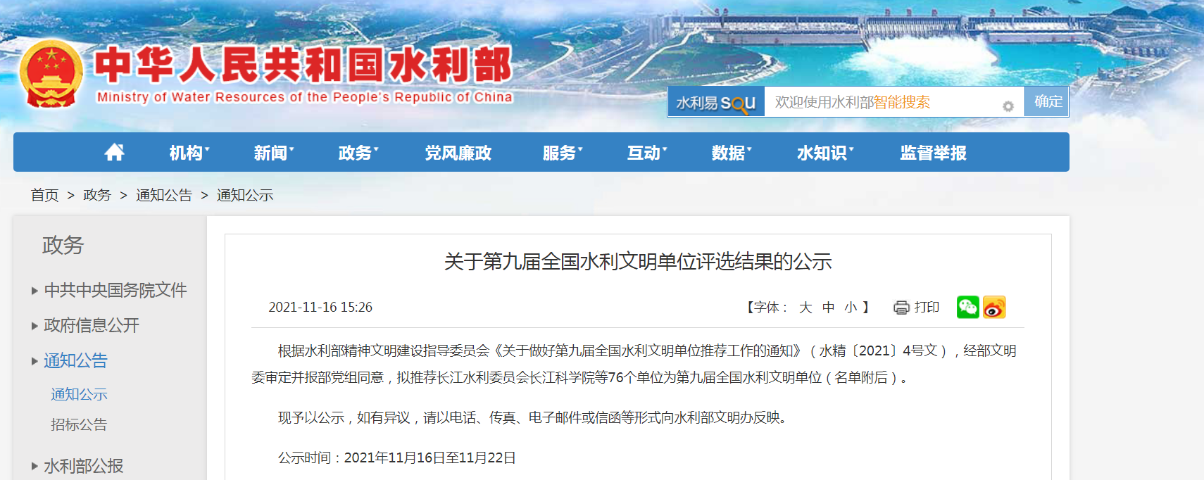 为展示水利精神文明建设丰硕成果,激发水利系统各单位参与精神文明建设积极性、主动性、创造性,2021年3月,水利部精神文明建设指导委员会启动第九届全国文明单位推荐申报工作,按照“从严把关、确保质量“的原则,经过严格规范评选,水利部文明委于近日公布了第九届全国水利文明单位的评选结果,我处成功入选第九届全国水利文明单位。