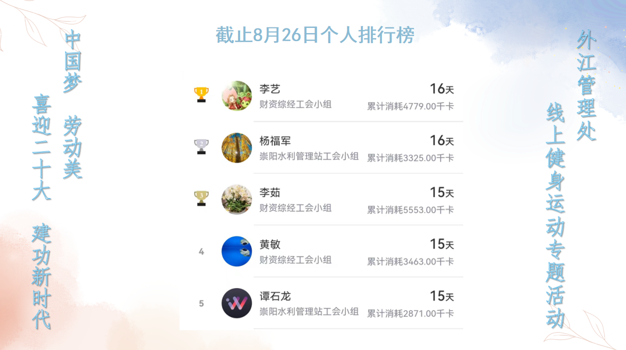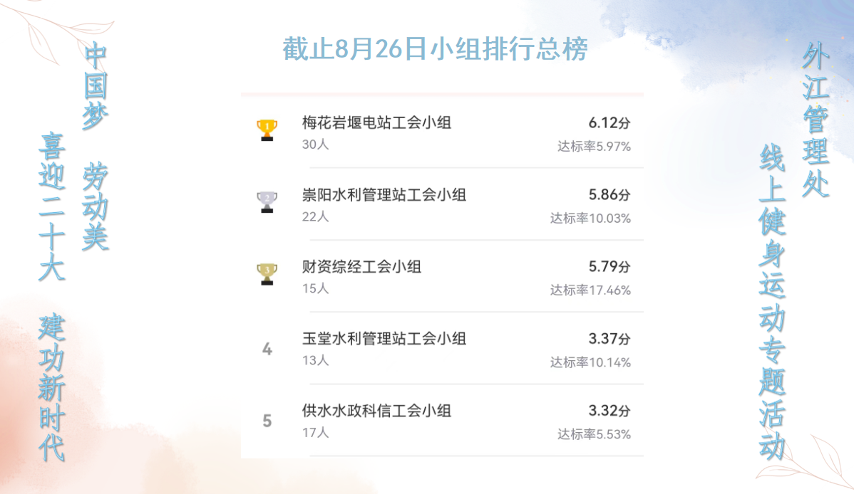 截至8月31日为止,全处共有200余名职工参加运动会。为了吸引更多职工参与此次活动,营造快乐健身的氛围,在全处掀起“云”动的新热潮,处工会每周一将个人总榜前50名和小组排行榜在机关大屏幕滚动播放,同时将在2022年12月31日线上运动会结束后,评选出个人奖和小组奖。此次线上运动会进一步提升了职工运动健身的积极性,进一步推动了健康文明、昂扬向上的文化氛围建设,让快乐健身的理念融入职工生活,受到干部职工的广泛好评。(党群工作科 )