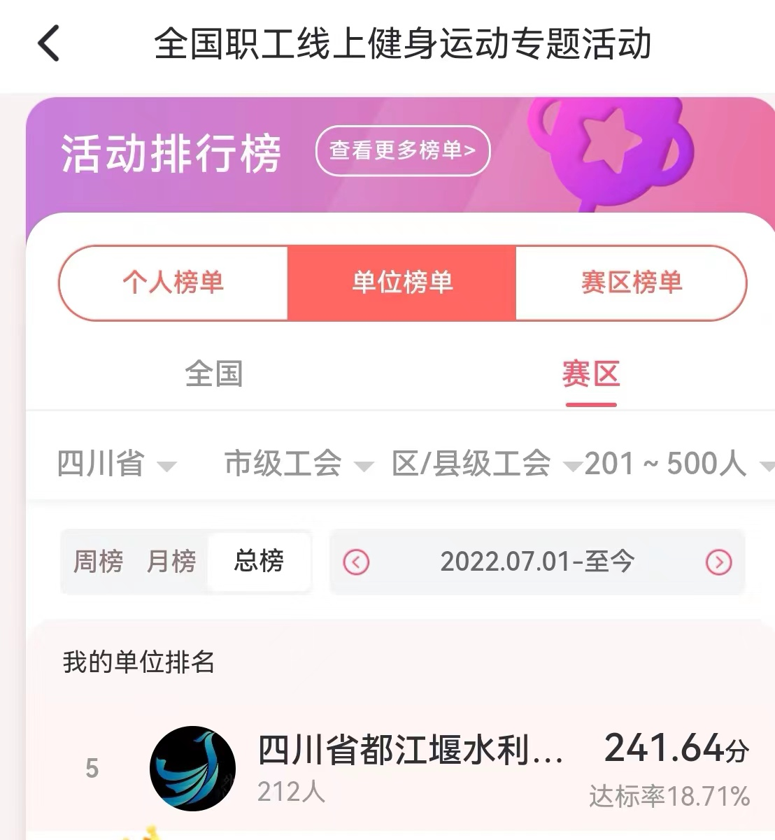此次活动从2022年7月开始至2022年12月底结束,历时6个月,处工会积极响应,精心筹划、认真组织,全处参与职工212人,在四川省赛区同等规模类别中取得了第五名的优异成绩。根据全总线上活动的综合排名,处工会将对成绩优异的部门及个人予以奖励。