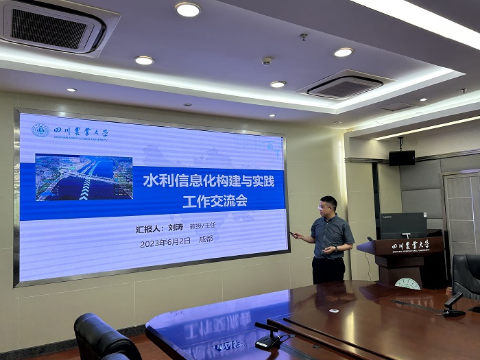座谈会上,川农大信息与教育技术中心主任刘涛围绕如何实现各类水利信息及其处理的数字化、网络化、集成化和智能化,对现代水利信息的开发和利用以及信息交流和信息共享进行了详细的讲解,技术中心工作人员和农大学生还分别就数字孪生流域及水利电子沙盘的建设和开发,如何加快构建具有“四预”功能的智慧水利体系向参会人员进行了演示。