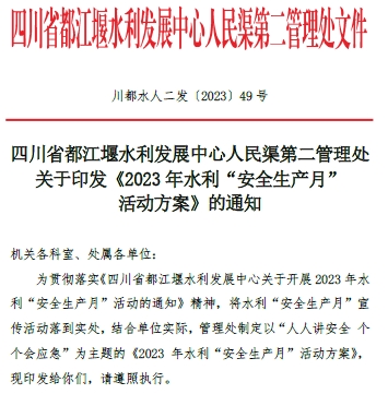 精心组织,部署到位。人民渠第二管理处制定以“人人讲安全 个个会应急”为主题的《2023年水利“安全生产月”活动方案》,将“安全生产月”活动纳入重点工作日程,与业务工作同谋划、同部署、同检查、同落实。引导干部职工积极投身水利安全生产标准化一级单位创建工作,提升单位本质安全水平,确保管理处安全生产形式持续稳定。