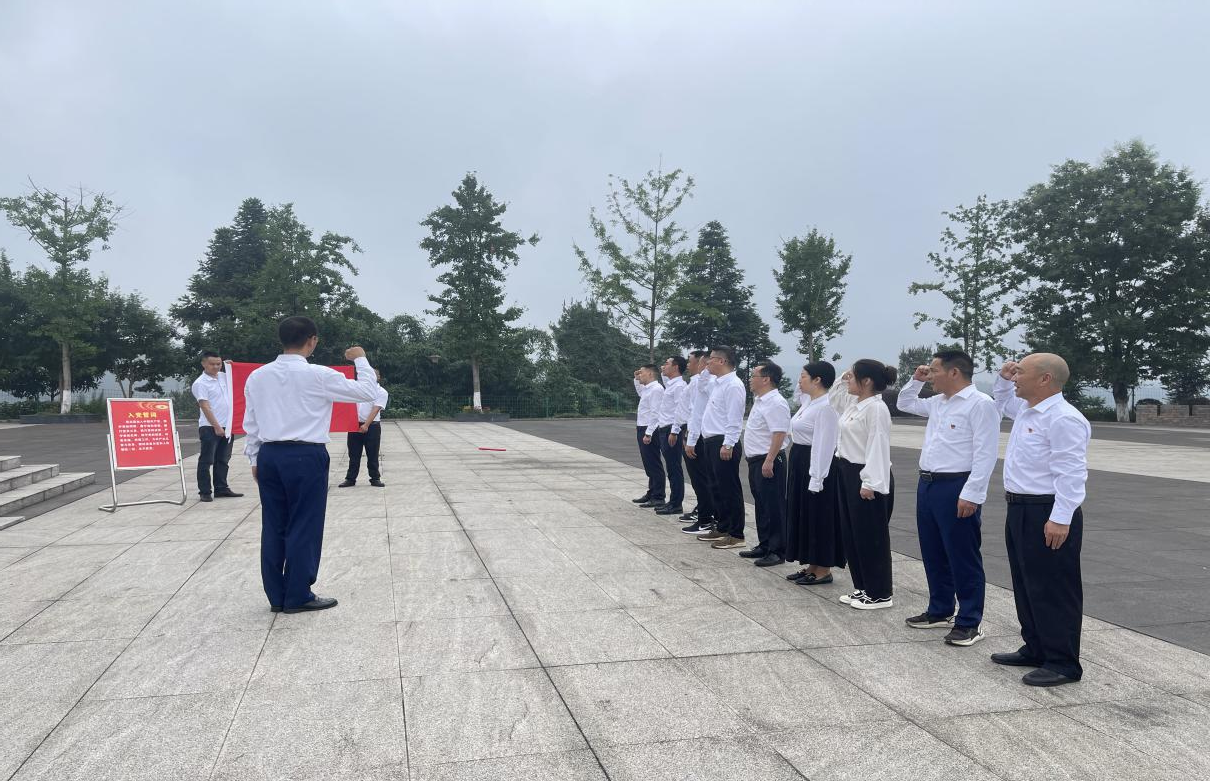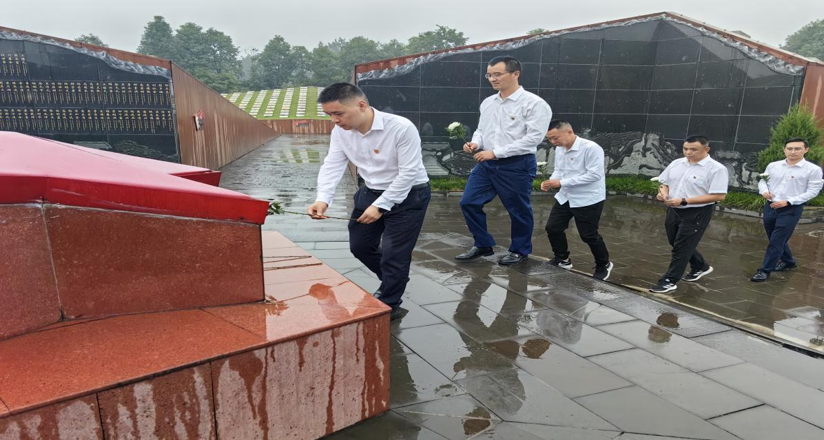 蒙蒙细雨中,红军百丈关战役烈士纪念碑前,全体党员着装严整,集体肃立,深切悼念为革命事业舍生忘死、英勇献身的革命先烈,缅怀他们不怕牺牲、不畏艰险的革命精神,并面向党旗重温入党誓词。