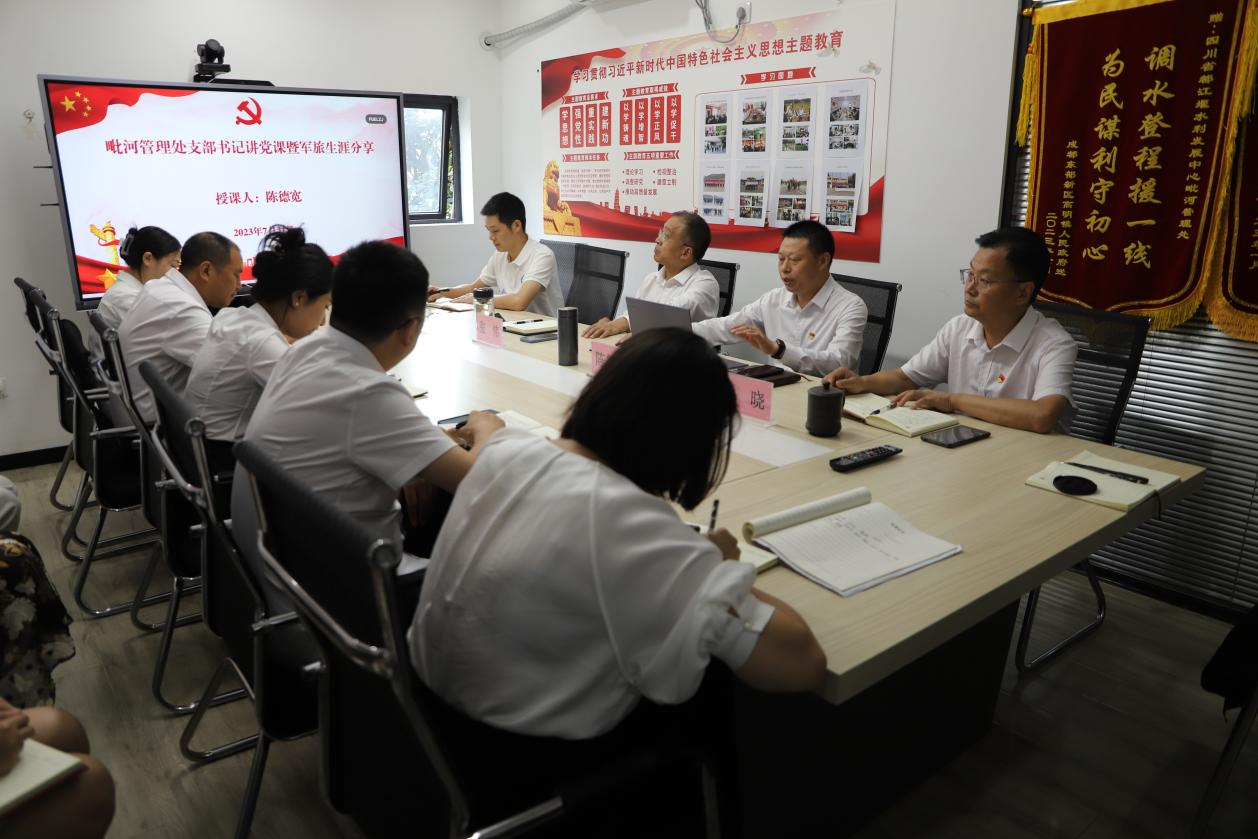 2023年7月31日下午,在“八一”建军节到来之际,结合当前学习贯彻习近平新时代中国特色社会主义思想主题教育,毗河管理处党支部书记在处机关会议室为党员、青年团员讲授专题党课、分享自己的军旅生涯。