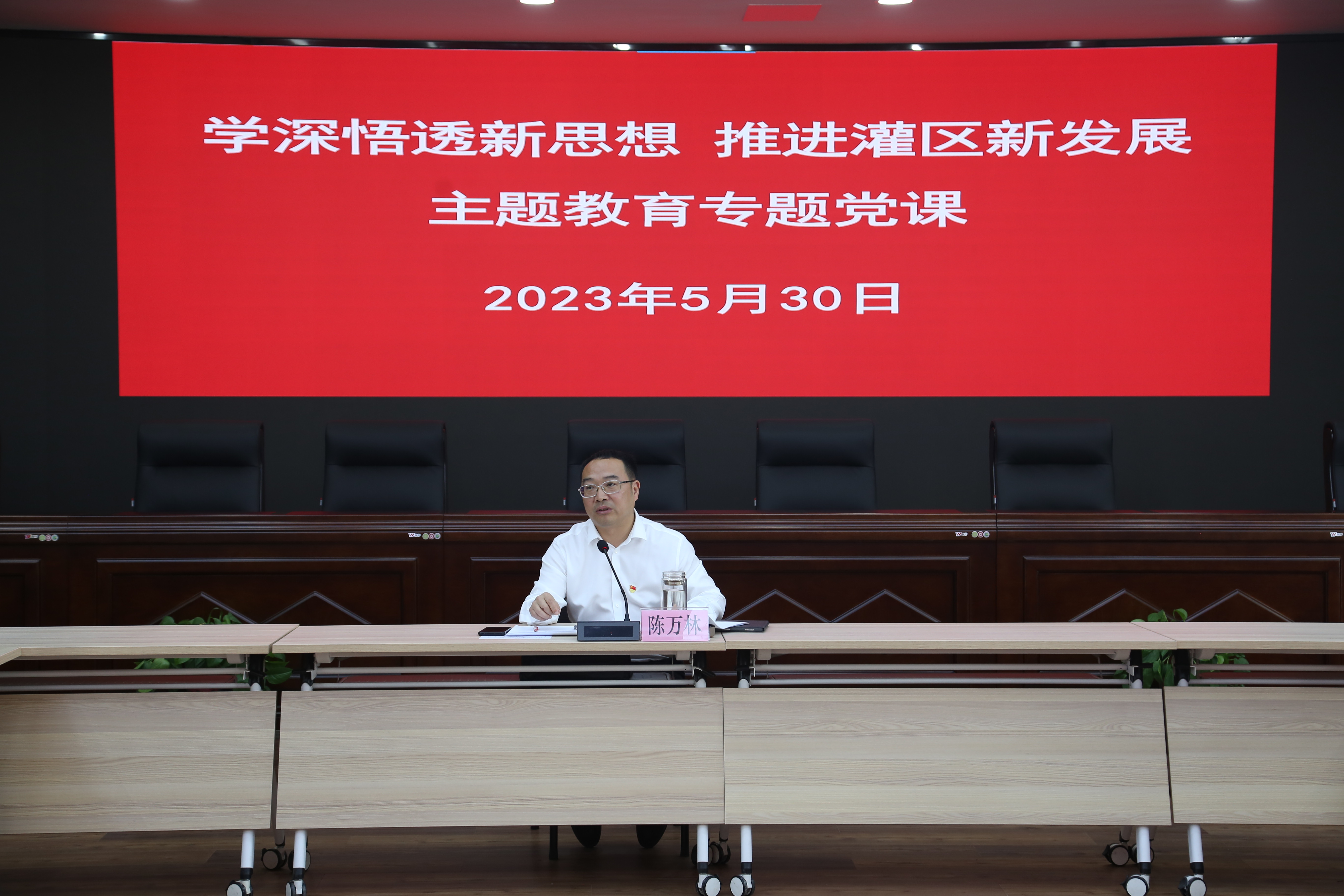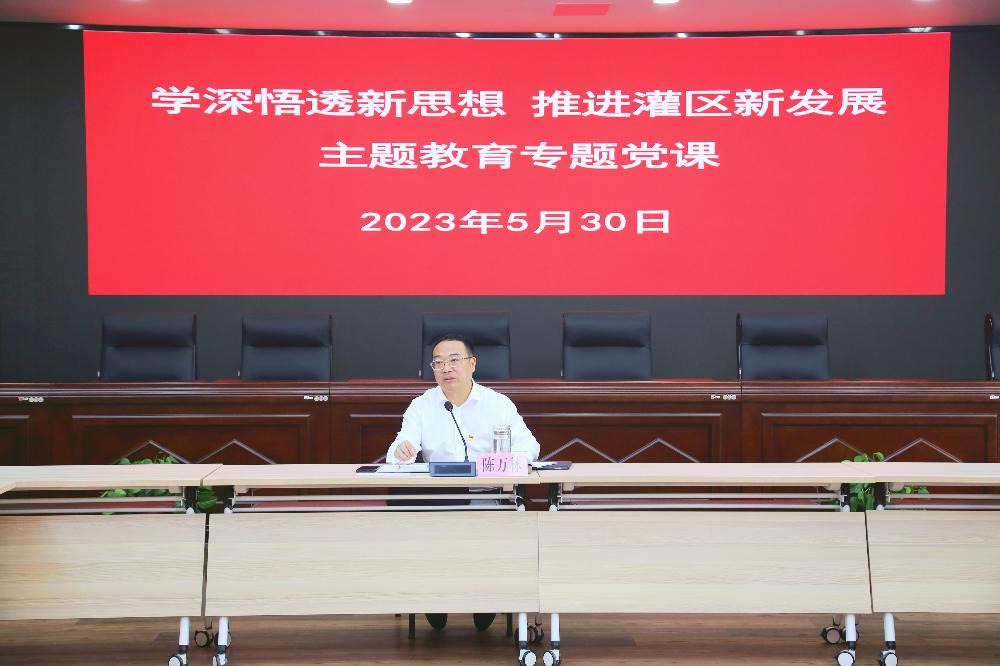 专题党课上,陈万林以《学深悟透新思想 推进灌区新发展》为题,从“创新、协调、绿色、开放、共享”五大新发展理念切入主题,特别是结合“一体化”改革“理念创新、管理创新、制度创新、文化创新、科技创新、增收创新”六大创新模式,为人民渠第二管理处干部职工讲授一堂生动形象的主题教育专题党课。