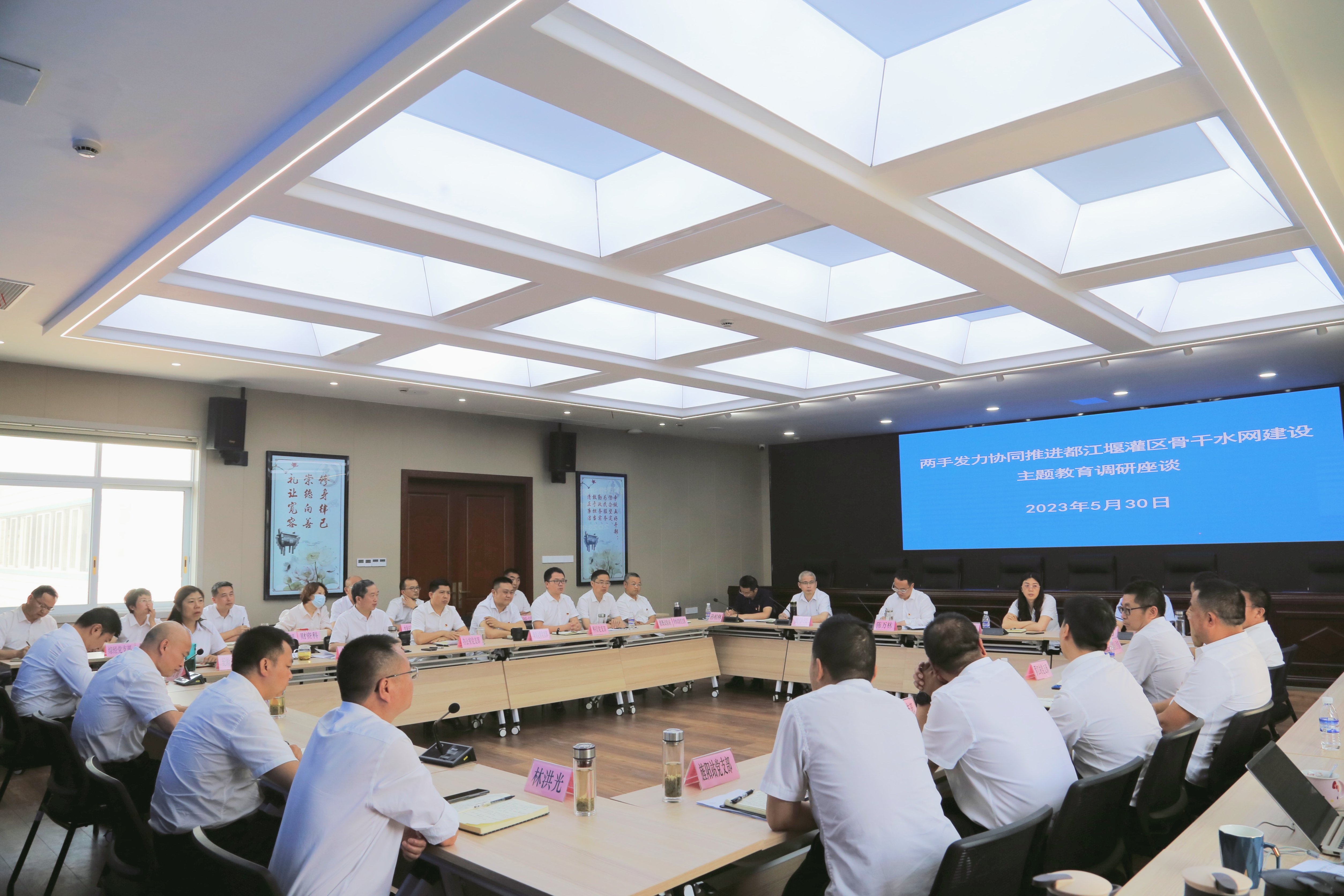 调研座谈中,围绕“两手发力协同推进都江堰灌区骨干水网建设”主题,班子成员对骨干水网工程现状、骨干水网工程规划、水利工程建设管理、信息化建设、涉水建设项目管理、基层管理能力提升等方面进行交流发言;各党支部对灌区高质量发展存在问题进行发言。