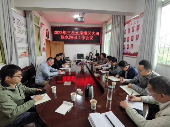 在东部新区水务监管事务中心(以下简称水务监管中心)副书记张德书、水资源处以及芦葭管理站相关人员的陪同下,调研组先后查看了江源干渠新市、永宁、雷一支渠尾灌区。在现场,管理站负责人介绍了灌区农作物收割、秧苗长势等情况。随后在芦葭管理站召开了2023年三岔水库灌区大田放水泡田工作会,会议专题研究本轮放水时间和具体输水方案。会上,水务监管中心各管理站汇报了灌区渠系工程维护、农作物收割、用水计划等情况;各方就当前工程安全、输水安全、灌区蓄水、需水情况、用水管理等作了交流发言。