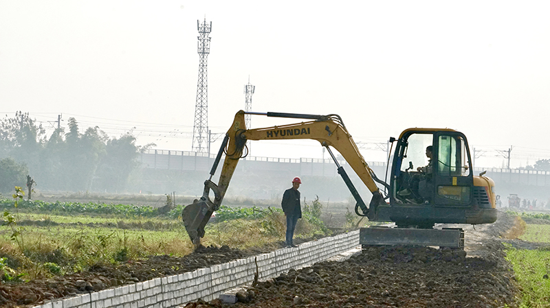 11月23日上午,记者在红岩渠牟尼庙支渠富新镇杜茅村段看到,新改建的渠道笔直向前,工人们正忙着进行渠身回填、渠底浇筑、渠墙砌筑,处处一片热火朝天的忙碌景象。