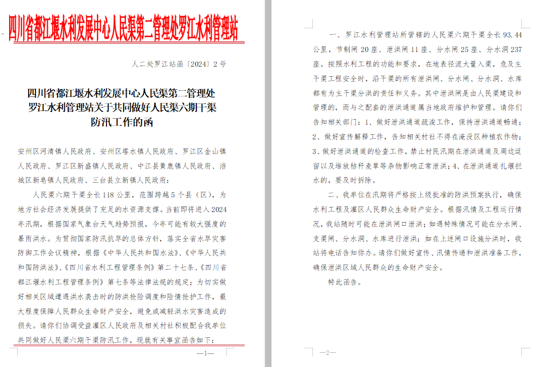 一是全线防洪,模块化管理,始终把灌区人民生命财产安全放在首位。人民渠六期干渠沿涪江和凯江分水岭蜿蜒排开,大部分位于丘陵地带,沿渠场镇、村社、建筑物繁多。罗江水利管理站把防洪区域以豆腐块形式分段细化,将渠系电站、水库、渡槽、险工险段、泄洪通道等重要点位在防汛预案中设置防汛专栏,记录不同水位下病险工段的运行情况,同时按照“电调服从水调,水调服从洪调”的原则,调节好电站发电和工程防洪的矛盾,并全线摸排泄洪通道是否畅通,将防汛排查情况和注意事项以函件的形式告知属地防汛抗旱指挥部和灌区乡镇,确保防洪工作应知尽知,不留死角。