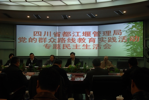 四川省都江堰管理局党的群众路线教育实践活动专题民主生活会于10月30日至31日在局附四楼会议室召开。会议紧紧围绕为民务实清廉这一主题,对照检查局党政班子和班子成员遵守党的政治纪律和贯彻中央“八项规定”及省委“十项规定”精神、转变作风方面的情况,联系思想和工作实际,剖析在形式主义、官僚主义、享乐主义和奢靡之风等方面存在的问题,积极开展批评和自我批评,研究提出进一步加强作风建设和建立长效机制的措施。