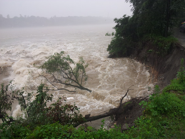 7月10日上午紫坪埔下泄流量达到3200立方米/秒,各处水利工程都承受着巨大的压力。10时左右,沙电巡渠人员在对小罗堰下游渠道工程进行巡查的过程中发现小罗堰溢洪道右侧护堤出现了较大面积的水毁溃堤,汹涌的洪水疯狂的冲刷着河堤背后的土地,河堤背后的公路路基随时有可能被掏空,洪水一旦决堤就将对周边的群众生命财产和电厂自身安全造成极大的威胁。