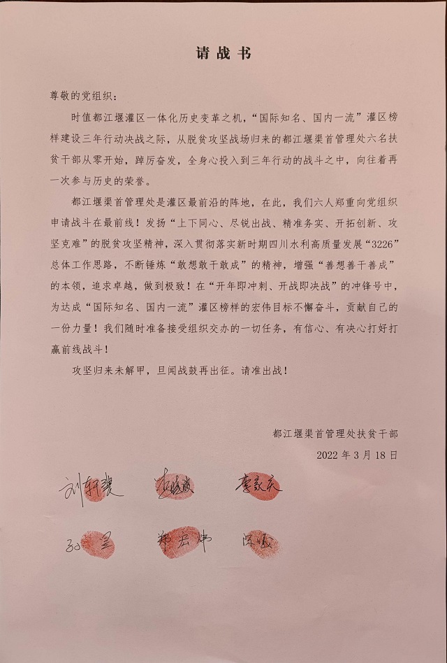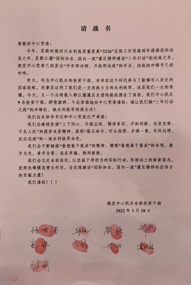 3月17日省都江堰水利发展中心召开中心机关和都江堰渠首管理处脱贫攻坚帮扶干部座谈会后,在省都江堰水利发展中心,一封封按满红手印的《请战书》纷至沓来,不断从机关各处(室)、都江堰渠首管理处递送到中心主要领导办公室。