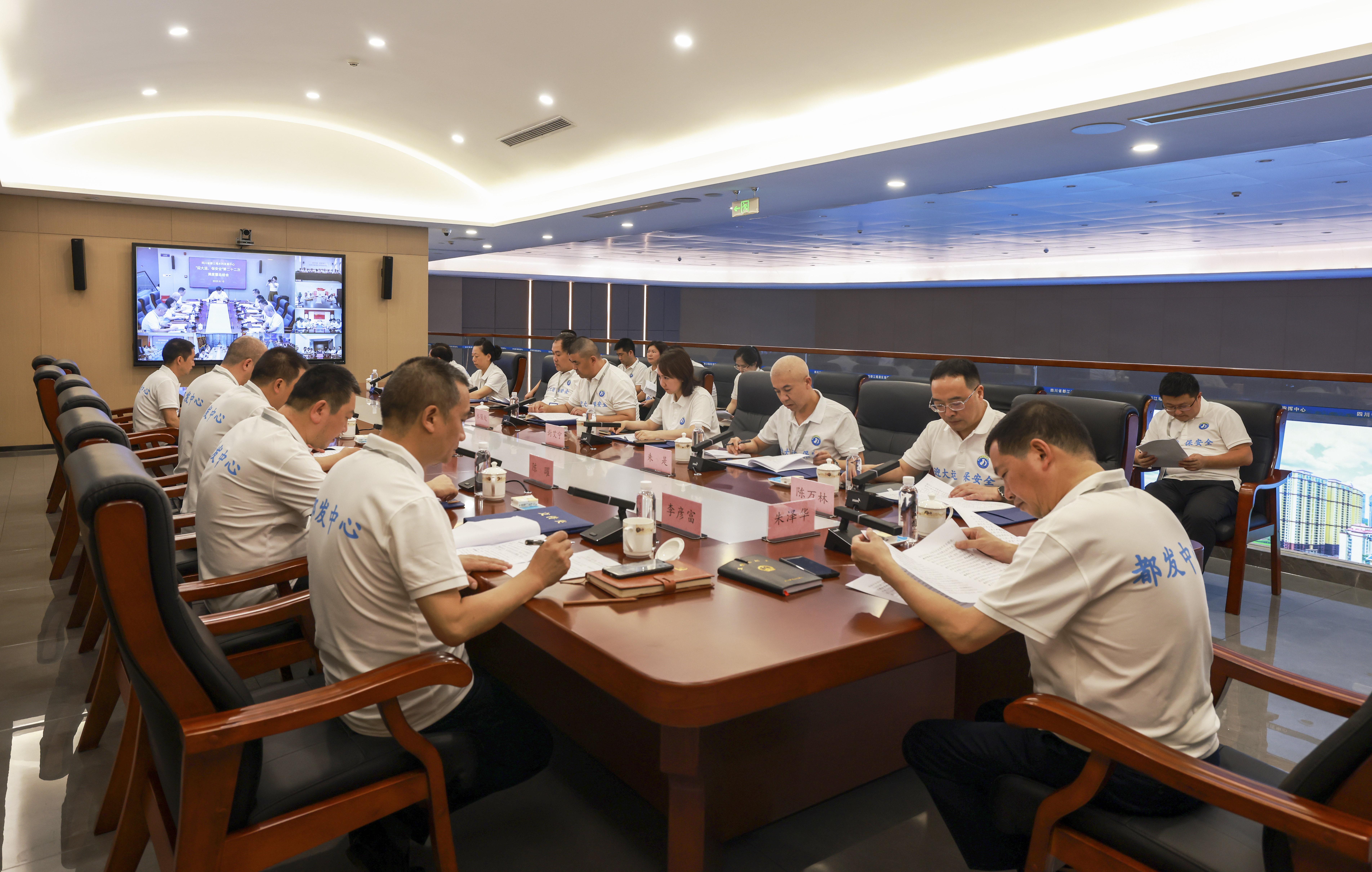 中心班子成员出席会议,中心成都大运会涉水保障工作专班组长、各工作组组长及相关成员,都江堰灌区指挥中心负责人,圣源旅游公司负责人在主会场参加会议。现场蹲点组组长及相关成员,灌区各管理处主要负责人、分管负责人及相关科室负责人在分会场参加会议。