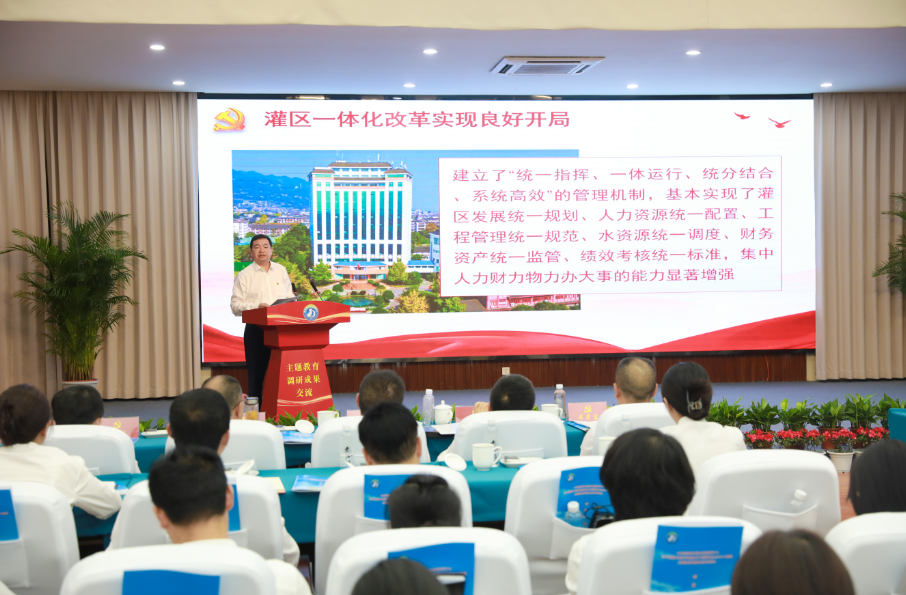 中心党委书记、主任朱泽华交流分享了中心主题教育调研总课题《以“六化建设”为路径,深化“两级管理”加快推进都江堰灌区高质量发展》的调研成果。