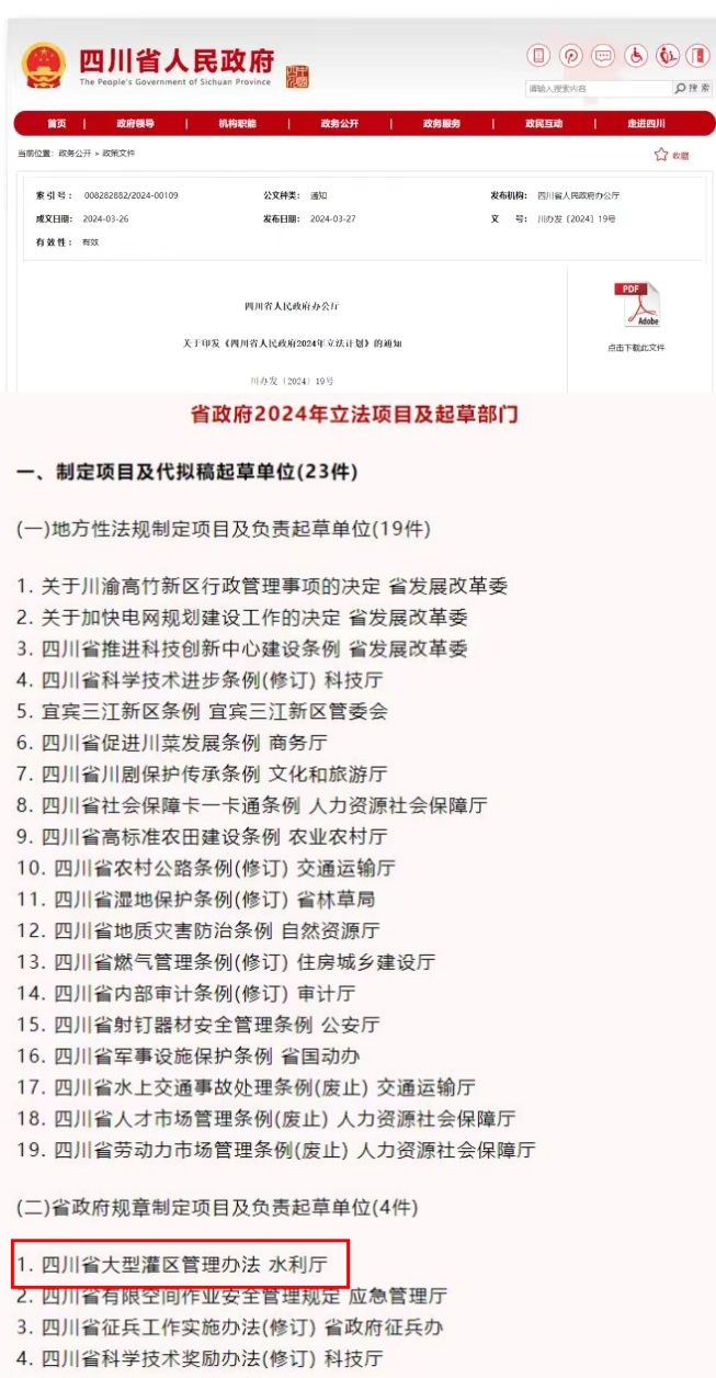 3月27日,省政府办公厅发布省政府2024年立法计划,《四川省大型灌区管理办法》成功列入今年度立法项目。