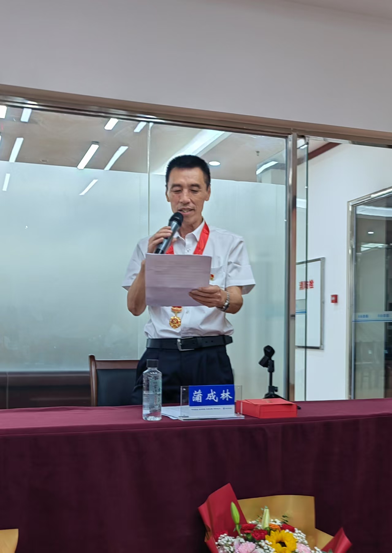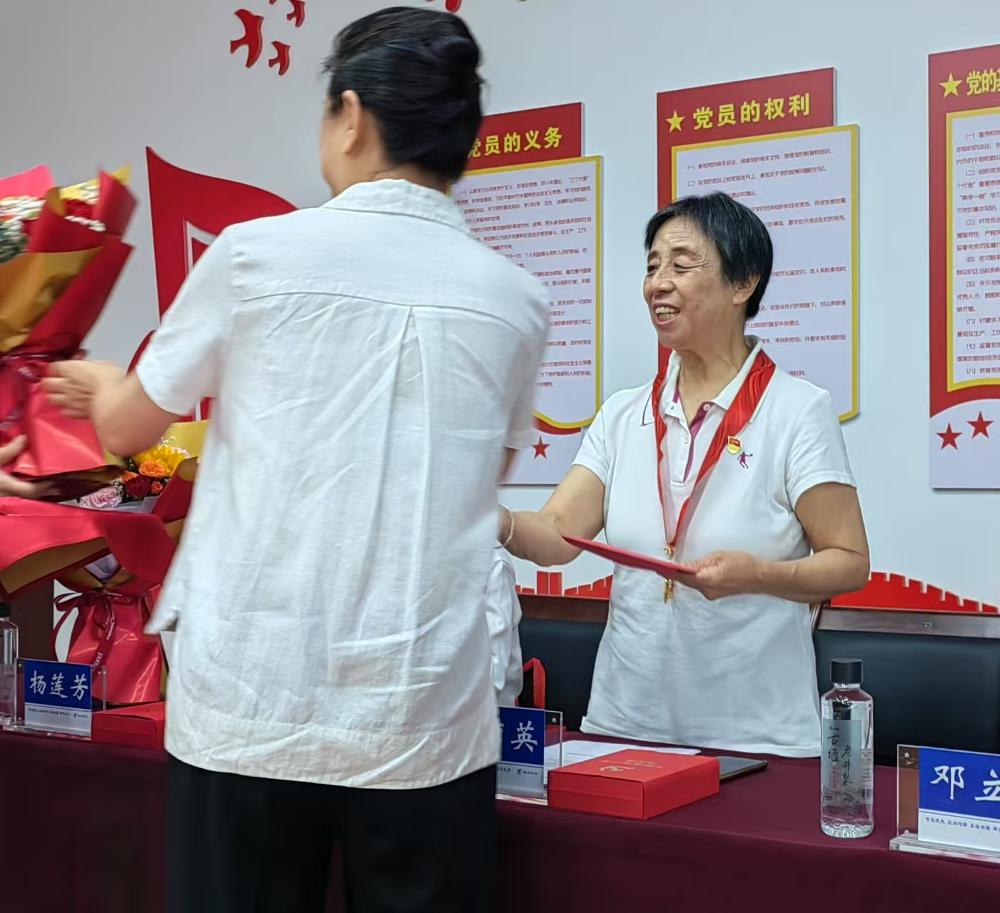 中心老党员邓立霜、杨祝君、雷秀英、蒲成林到现场接受颁章。外江管理处老党员蒲成林同志作为中心获章代表在仪式上发言。他深情回顾了50年听党话、跟党走的奋斗历程,表达了对党的无限忠诚与对水利事业的深厚感情。