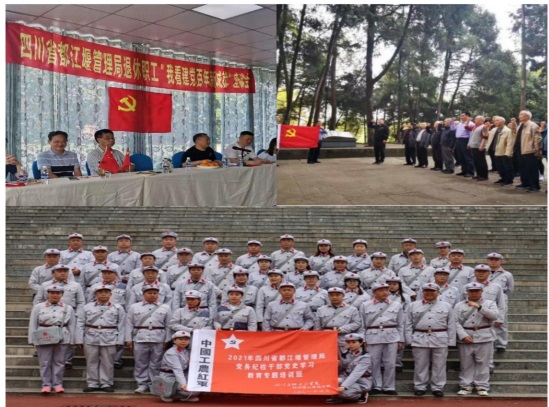 广大党员“体验式”学。延伸党课教学场景,将“教室”由室内搬到室外,由书本搬到实景,以实地实景催动真情真意,让党史学习教育接地气,入人心。参加水利厅“百年新征程·百题百人答”越野活动,参赛队员们在工作和训练之余挤出时间学习党史知识,最终在比赛答题环节中获得满分,荣获一等奖;召开“我看建党百年新成就”座谈会,组织退休党员干部畅谈建党百年辉煌历程,回顾都江堰的发展变化,展现老一代都江堰水利人退休不退志,离岗不离党的精神面貌;组织党务纪检干部在四川长征干部学院阿坝雪山草地分院开展党史学习教育专题培训,以党史学习为主题,传承红色基因为载体,重走长征路,弘扬伟大的长征精神,锤炼党性;财资科党支部和建行都江堰支行党支部联合开展主题党日活动,共同参观红色文化书院——长征书院,参观了党史文化墙、红军丰碑廊、开国元勋廊、长征文史博物馆等展览馆,接受党史教育,学习长征精神。