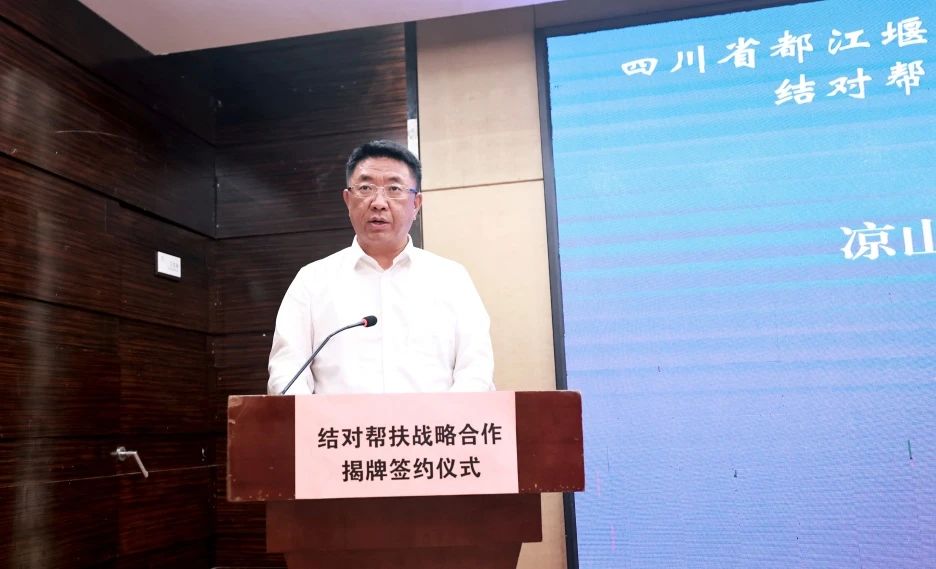 朱泽华感谢凉山州一直以来给予都江堰灌区帮扶干部的倾情关怀。他表示:凉山州是全国决战决胜脱贫奔康的生动范例,书写了中国脱贫故事上的生动一页;在全省“大兴水利、大办水利、办大水利”的冲锋号中,推进凉山水利事业高质量发展大有可为,也大有作为。都江堰灌区与凉山虽远隔千里,但相互之间的牵挂却始终“在线”,在脱贫攻坚和乡村振兴事业中,百余名都江堰水利人在大凉山深处留下了印记,与凉山干部群众结下了深厚情谊。此次签约结对,既是政治使命,也是深化和延续“凉山情谊”的务实举措,希望双方着力构建协调联动、优势互补、精准发力、互助共享的合作关系,互为支撑、共同发展。