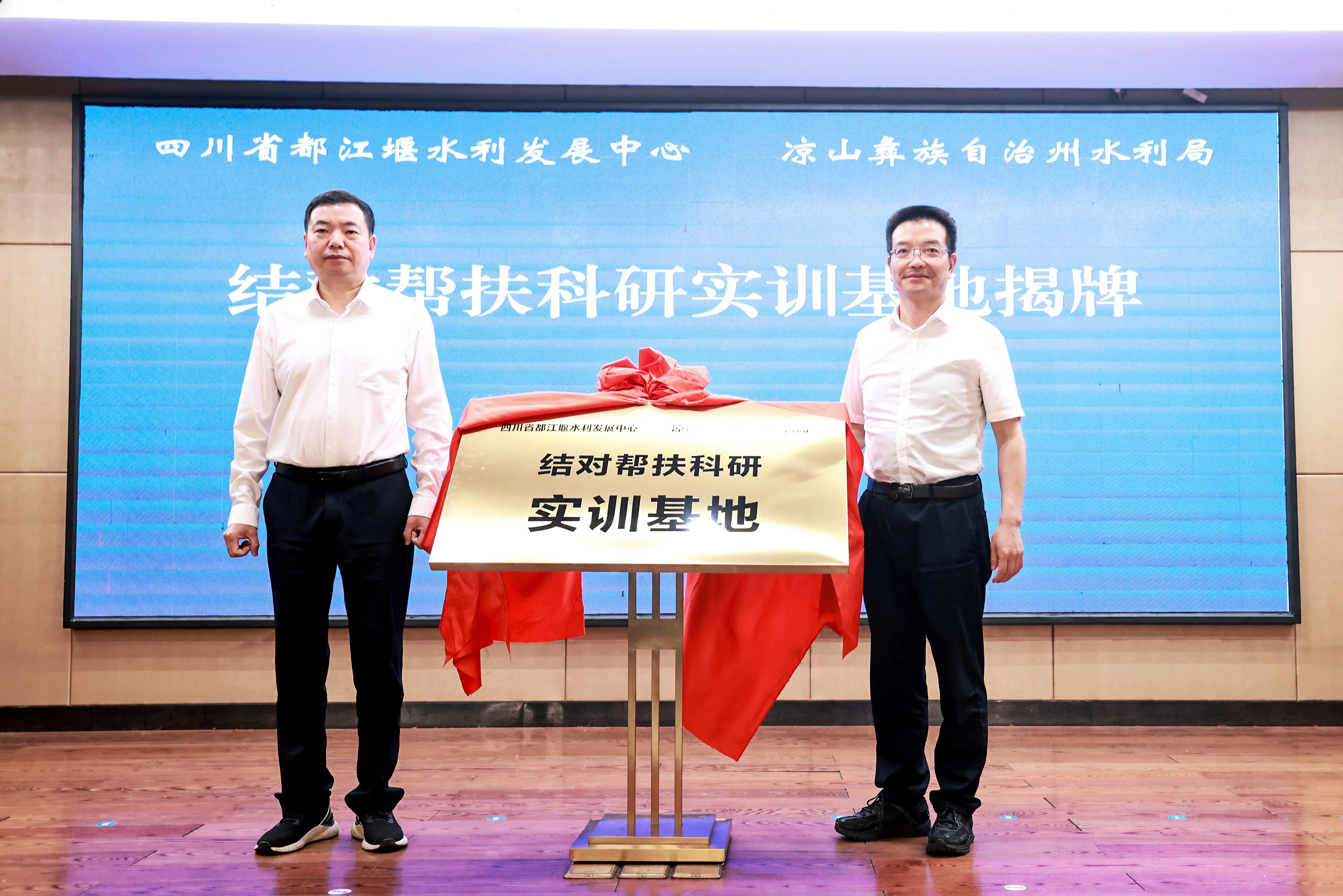 仪式上,四川省都江堰水利发展中心党委副书记李彦富、凉山州水利局党组成员、副局长杨文才共同签署《结对共建框架协议书》;朱泽华、曾浪舟共同为结对帮扶科研实训基地揭牌。