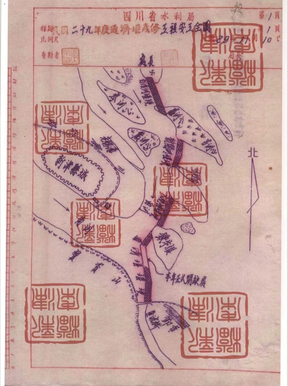 近日,省都江堰水利发展中心通济堰管理处在新津区档案馆查阅发现了一套1940年(民国二十九年)通济堰岁修施工图,这一难得的发现再为通济堰2100多年灿烂的历史添上了一块重要的近代拼图。根据施工图描述得知,当时进行工程维护花费了160314法币,此套施工图清晰的记录了当时的地形地貌和施工方案位置,不仅呈现了西河引水枢纽工程状况,也反映了从西河引水入通济堰的重要性,通济堰建造以来,为解决水源南河时段性缺水问题,自古就将都江堰外江的水经过羊马河汇入西河后作为补充水源。