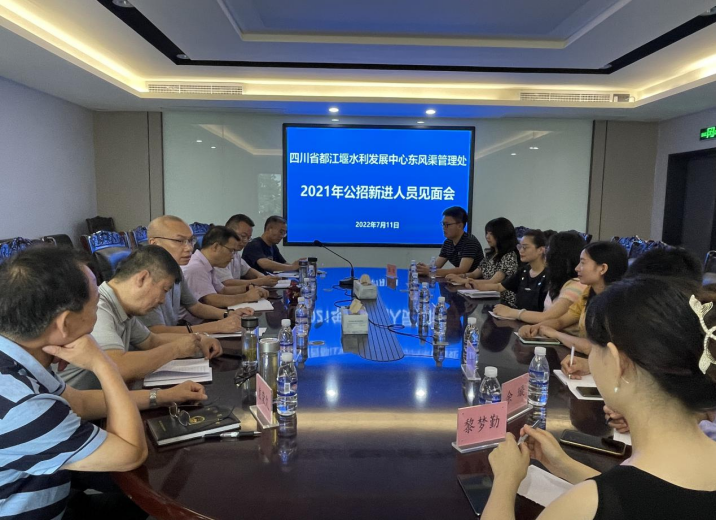 2022年7月11日,都发中心东风渠管理处召开2021年公招新进人员见面会。在家处领导、新进人员所在部门负责人参加会议,会议由人事科科长张伟主持。