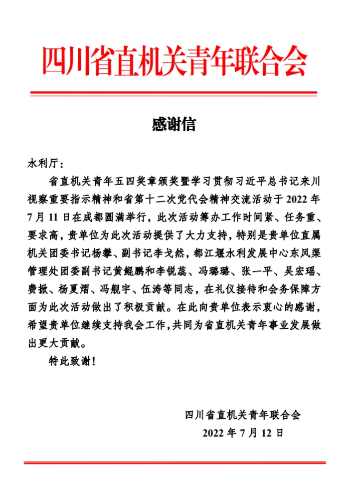 近日,都发中心东风渠管理处青年志愿者收到由水利厅转交的四川省直机关青年联合会感谢信。