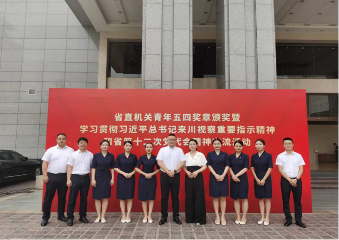 2022年7月11日,省直机关青年五四奖章颁奖暨学习贯彻习近平总书记来川视察重要指示精神和省第十二次党代会精神交流活动在成都圆满举行,水利厅直属机关团委带领都发中心东风渠管理处黄鲲鹏、李锐蕊、冯璐璐、张一平、吴宏瑶、费掀、杨夏熠、冯舰宇、伍涛等9名同志组成的青年志愿者团队,顺利完成颁奖礼仪和会务保障工作。
