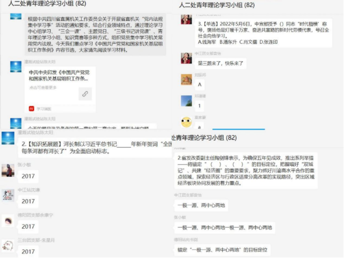 线上学习由人民渠第二管理处团委牵头,各小组通过青年理论学习微信群轮流组织学习。全处青年通过学习2022年政府工作报告、四川省河湖长制条例、省第十二次党代会精神、团的章程、论党的青年工作、时事政治等内容,积极参与随机提问抢答、分享学习体会,营造出浓厚的学习氛围。
