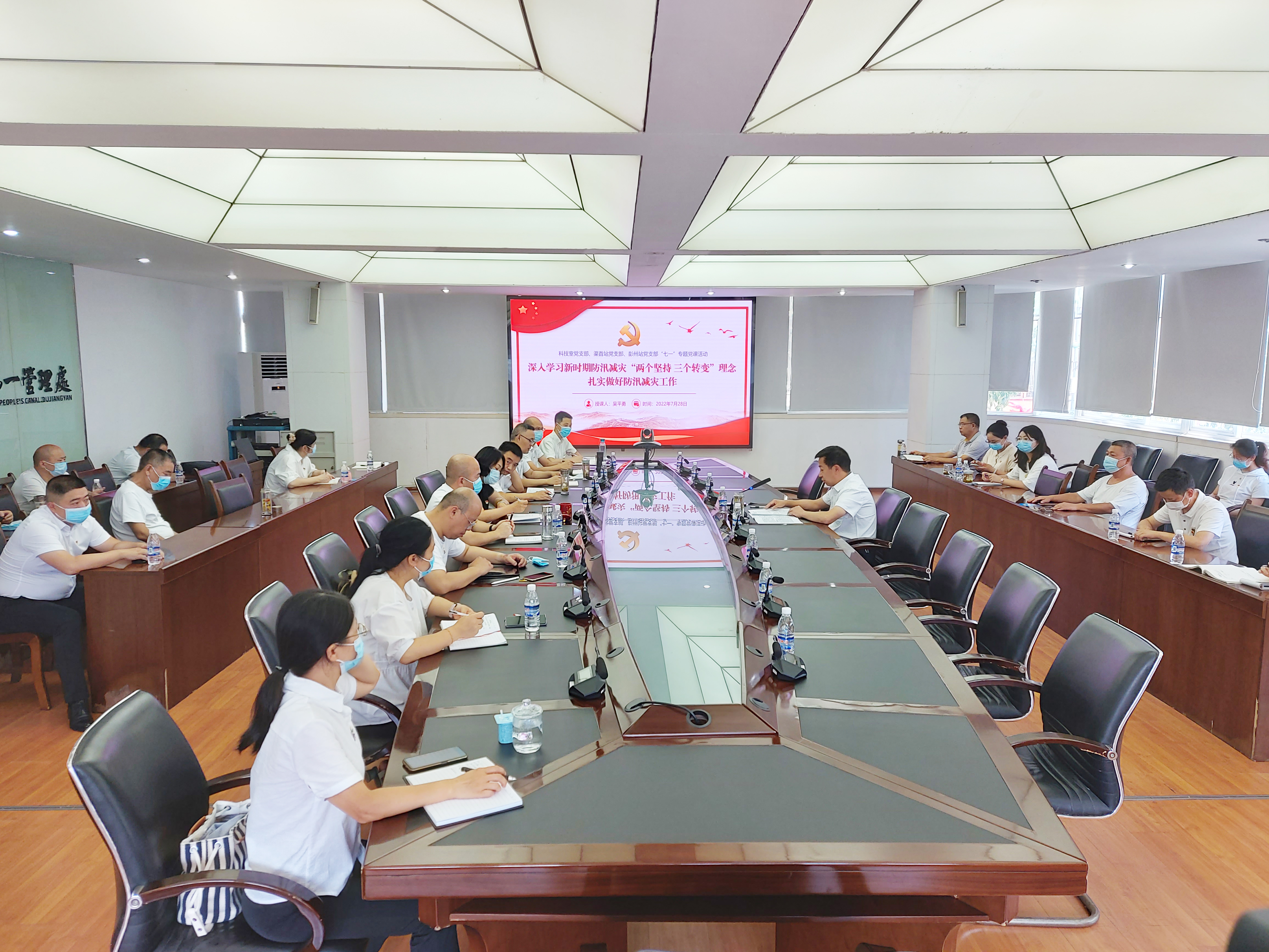 为隆重庆祝建党101周年,教育引导广大党员传承红色基因、牢记初心使命、投身火热实践。,按照省委组织部安排部署和“干什么、学什么、教什么”的讲党课的有关要求,7月29日,人民渠第一管理处党委委员、副处长吴平勇聚焦防汛关键期如何迎大考,为科技室党支部、渠首站党支部、彭州站党支部党员干部讲授授“深入学习新时期防汛减灾‘两个坚持 三个转变’理念 扎实做好防汛减灾工作”专题党课。科技室党支部、渠首站党支部、彭州站党支部党员干部参加。