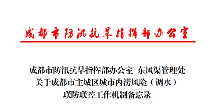 为深入贯彻习近平总书记来川视察时关于防大汛、抗大险、救大灾重要指示,坚决落实全省防汛救灾工作调度会议和都发中心防汛抗旱工作调度会精神,进一步提升成都市主城区内各水利部门协同应对城市内涝的能力和水平,都发中心东风渠管理处积极探索、主动作为,与成都市防汛抗旱指挥部办公室共同制定了《关于成都市主城区城市内涝风险(调水)联防联控工作机制备忘录》,为有效防范和处置成都市主城区城市内涝风险,最大限度减少灾害损失,全力保障人民生命财产安全迈出了坚实的一步。