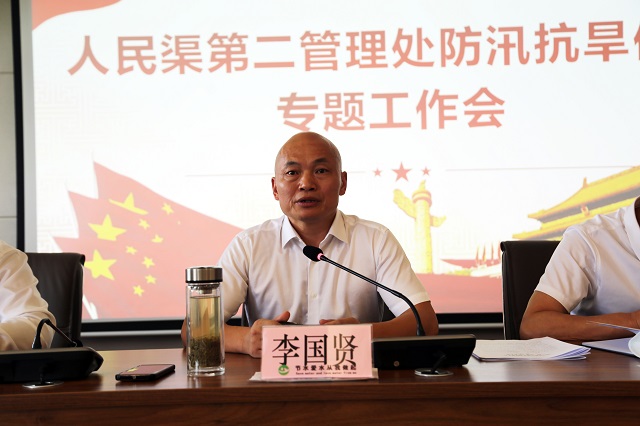 李国贤在传达都发中心防汛抗旱保供专题会议精神时强调:一方面是岷江来水形势不容乐观,人民渠二处作为尾水灌区尤其需要上下联动,多措并举,广开水源,优先保障城乡居民生活用水,坚守粮食生产安全底线,尽全力保障供水安全;另一方面要持续做好灌区输蓄水工作,牢固树立“防大汛、抗长旱”的工作意识,尽职履责,确保灌区106.8万亩水稻用水及粮食丰收。